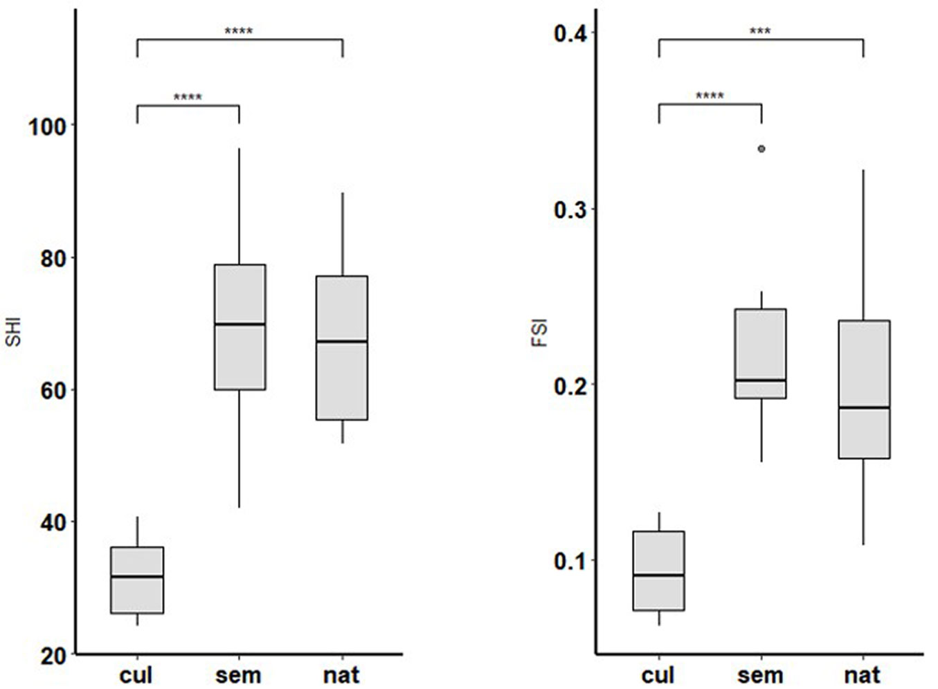 Fig. 2 - Statistical differences (Tukey HSD test) of (a) SHI (F[2, 24] = 24.44, p < 0.001) and (b) FSI (F[2, 24] = 15.35, p < 0.001) index mean values among stand types. (cul): cultivated; (sem): semi-natural; (nat): natural); (***): p<0.001; (****): p<0.0001.