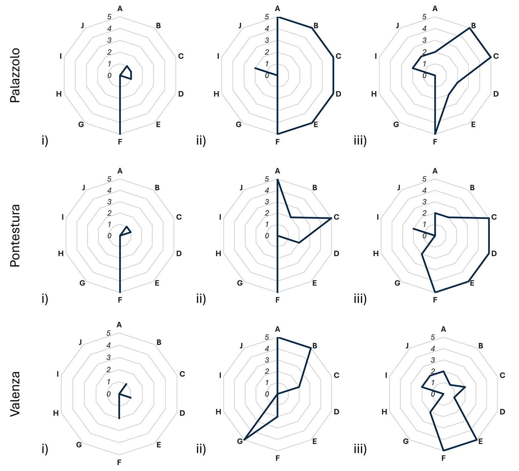 Fig. 3 - Radar plot indicating IBP values for each site and stand type: (i) cultivated, (ii) semi-natural, (iii) natural. (A): native species; (B): vertical structure; (C): large size standing dead wood; (D): large size lying dead wood; (E): large size living trees; (F): dendro-micro-habitat; (G): open spaces; (H): forest cover; (I): water habitat; (J): rocky habitat.