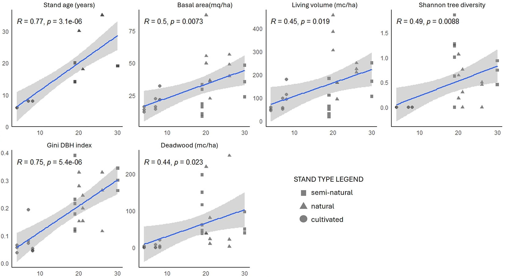 Fig. 4 - Correlation plots with linear regression for the IBP partial values (x-axis) with the selected structural parameters (y-axis). Plots representing the three stand types are drawn with different shapes (see legend).