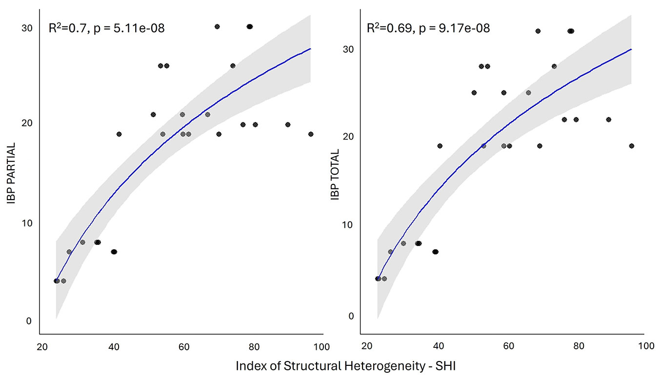 The correlation matrix (Fig. S4 in Supplementary material) shows the strongest correlations (R > 0.6) among single structural parameters (e.g., quadratic mean diameter and living volume) and between the SHI and FSI indices. Linear regression highlights the strongest positive significant correlation of IBP with stand age and Gini coefficient for diameter (Fig. 4). Both total and partial IBPs were strongly correlated (R ≥ 0.7, p < 0.001) with the SHI index. This latter was used for logarithmic regression analysis (Fig. 5) as it showed strong correlations (R > 0.80, p < 0.001) with IBP partial and total scores (Fig. S5). The logarithmic regression provides a better fit to the IBP trend than the linear model, accurately representing the initial rapid increase followed by a plateau at higher SHI values.