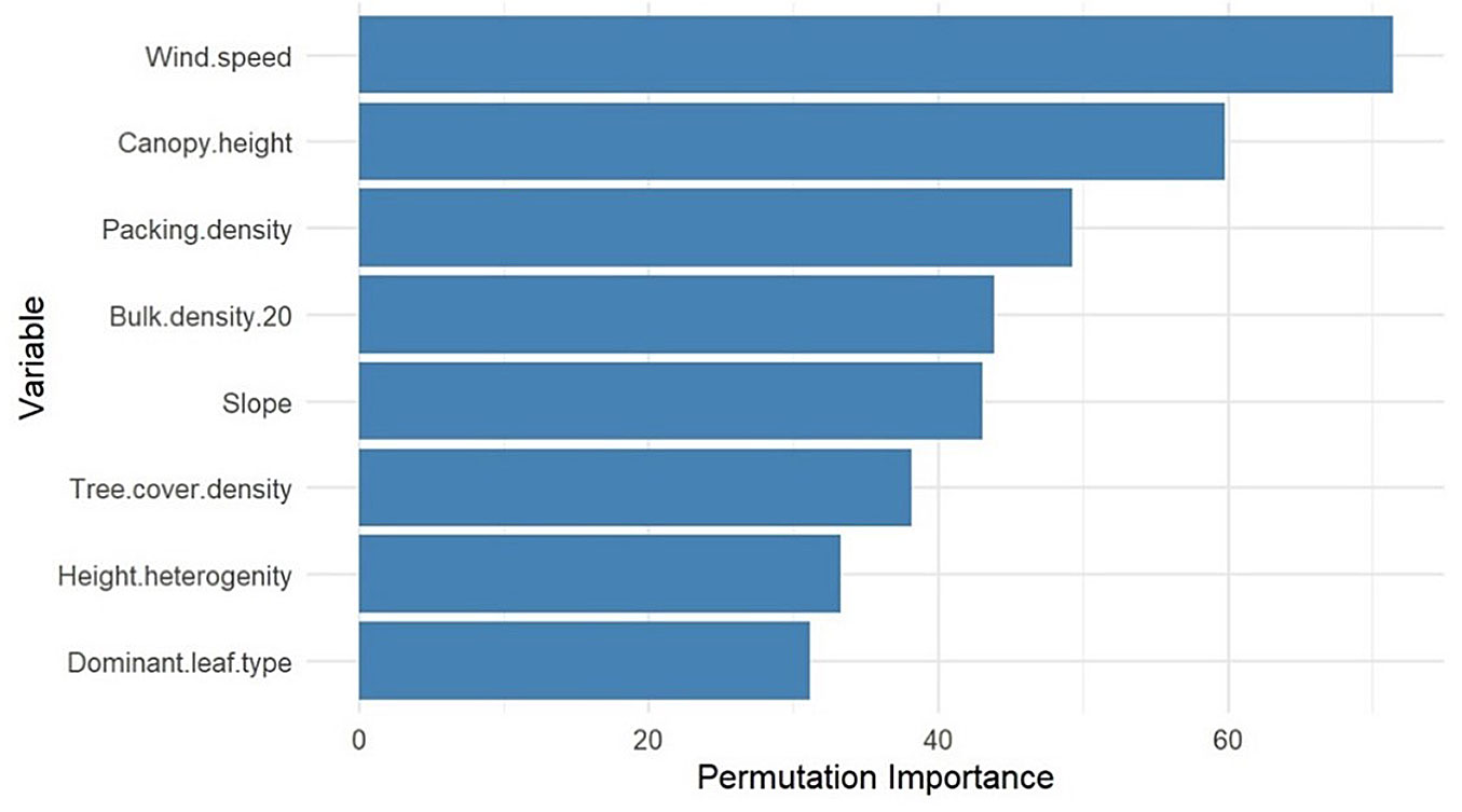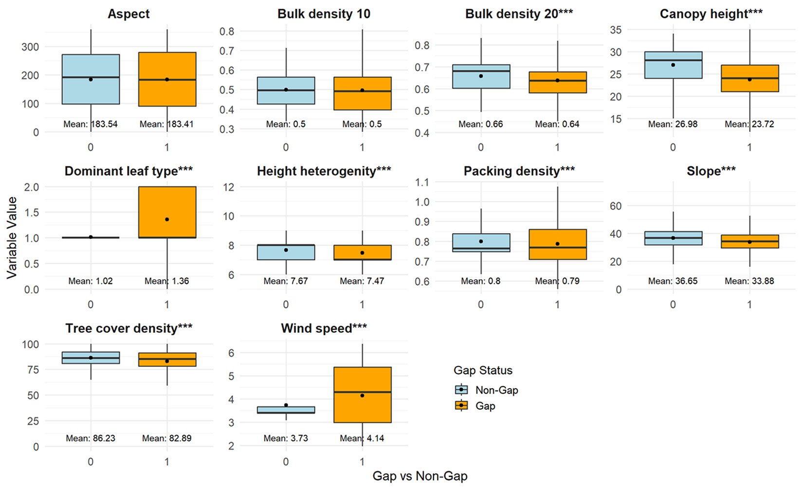 Our windthrow-vulnerability analysis further informs prioritization of interventions. Wind speed, canopy height, and soil packing density emerged as primary predictors of gap occurrence in the random-forest model; this aligns with other modelling and empirical studies identifying wind exposure and stand structure as principal controls on windthrow risk ([30]) and agreeing with the critical environmental factors include wind speed and storm intensity; sustained winds of 95 km h-1 or higher, or gusts reaching 130 km h-1, substantially elevating the likelihood of windthrow by over 50% ([32]). However, some of the directions in our gap vs. non-gap comparisons require cautious interpretation. For instance, gaps in our data were associated with lower canopy height and lower height heterogeneity (Fig. 3), a pattern opposite to some expectations, as in the studies of Taylor et al. ([32]) and Forzieri et al. ([13]), shows that taller stands face greater bending stress, and dense, uniform plantations are more prone to windthrow than mixed, natural forests. Several factors could explain this: (i) selective removal of taller trees by past disturbances or logging leaving shorter remnant canopies where subsequent windthrow occurs; (ii) local site exposure interacting with stand architecture (e.g., short uniform stands on exposed ridges being more vulnerable than taller heterogeneous stands on sheltered slopes); or (iii) sampling scale effects where within-gap measures reflect remnant stumps and resprouts rather than pre-failure canopy structure. Therefore, we cannot verify which mechanism predominates without pre-disturbance tree-level data, especially the slenderness ratio between diameter at breast height and tree height as a principal parameter of tree vulnerability to windthrow.